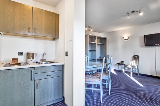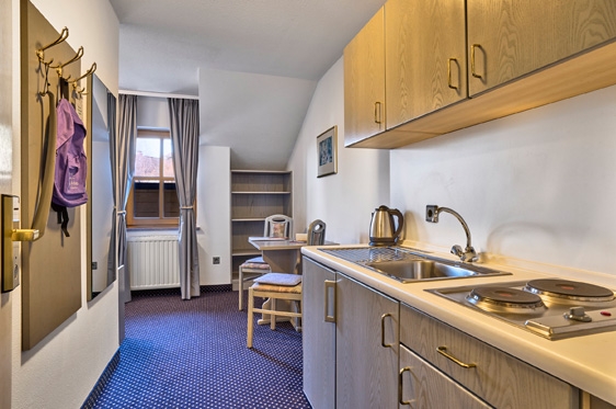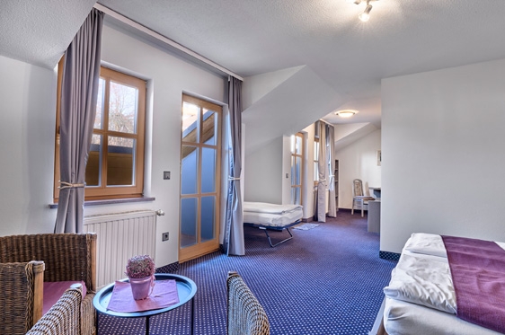 Familiekamer balkon (4-4 personen): ca. 40 m2 en voorzien van 2-persoonssofabed, zithoek, tv en WiFi. Aparte slaapkamer met 2-persoonsbed. Kitchenette met 2 kookplaten, koelkast en waterkoker. Badkamer met douche en toilet. Balkon.