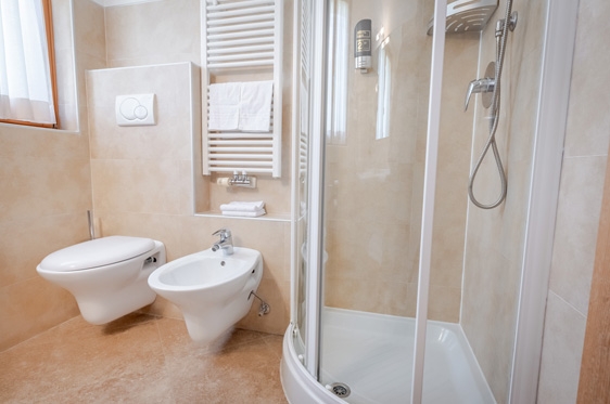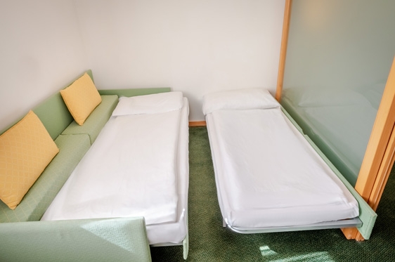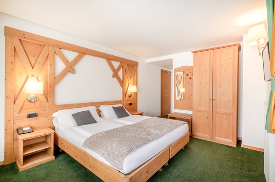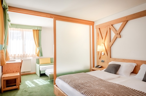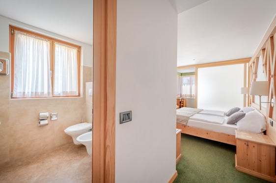 Juniorsuite (2-4 personen): type Mughetto, ca. 28 m2 en voorzien van 2-persoonsbed, 2x 1-persoonssofabed, tv, WiFi, koelkast en kluisje. Badkamer met douche, föhn en toilet.