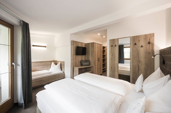 3-persoonskamer (2-3 personen): type standaard met een eenvoudige inrichting, ca. 20 m2 en voorzien van 2-persoonsbed, extra bed, tv, WiFi en kluisje. Badkamer met douche, fön en toilet.