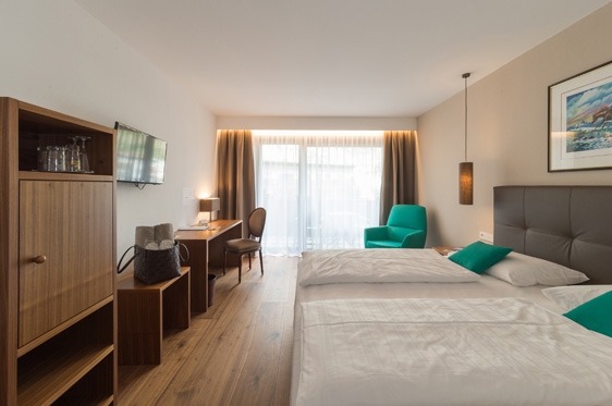 2-persoonskamer Alpen (2-2 personen): min. 31 m2 en voorzien van 2-persoonsbed, zithoek, tv, WiFi, airco, kluisje en minibar. Badkamer met bad/douche, föhn, badjas en toilet. Balkon.