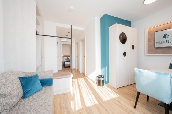 Familiekamer (2-4 personen): type Familien Suite, min. 36 m2 en voorzien van woon-/slaapkamer met 2-persoonssofabed, airco, zithoek, tv, WiFi, koelkast en kluisje. Aparte slaapkamer met 2-persoonsbed. Badkamer met douche, föhn en toilet.