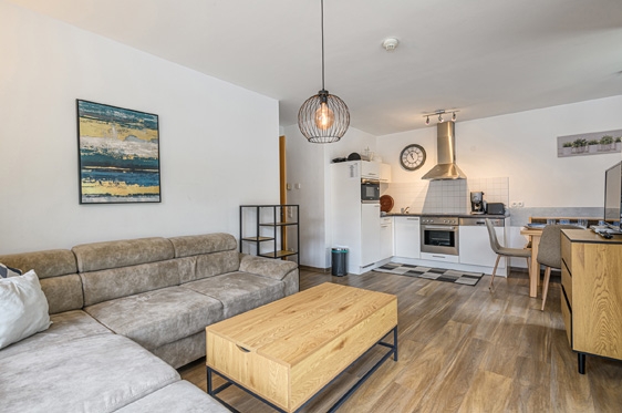 3-kamerappartement balkon (1-4 personen): ca. 55 m2 en voorzien van woonkamer met zithoek, eethoek, tv en WiFi. Keuken met kookplaten, oven, koelkast, vaatwasser, waterkoker, toaster en koffiezetapparaat. 1x slaapkamer met 2-persoonsbed. 1x slaapkamer met 2x 1-persoonsbed. Badkamer met bad/douche, föhn en toilet. Balkon of terras.
