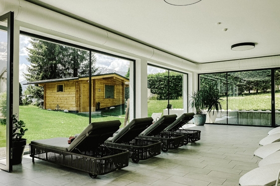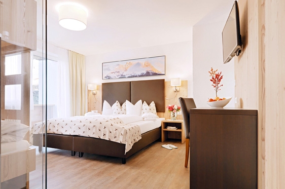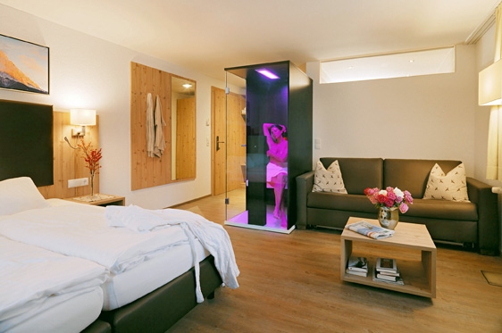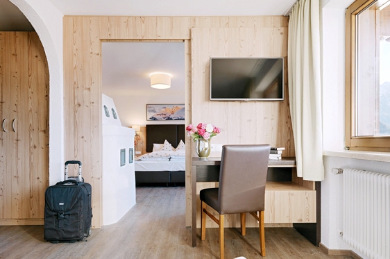 Suite type X (2-4 personen): type Zirbe, ca. 32 m2 en voorzien van extra breed 2-persoonssofabed, tv, WiFi, koffie-/theehoek, koelkast en kluisje. Aparte slaapkamer met 2-persoonsbed. Badkamer met bad/douche en toilet. Balkon.