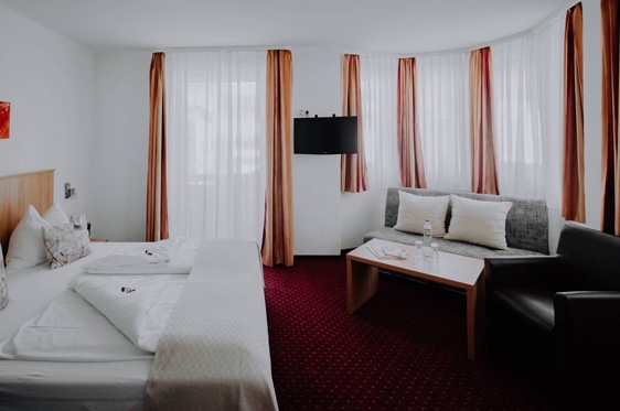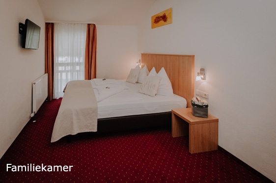 Familiekamer balkon (2-4 personen): min. 35 m2 en voorzien van slaapkamer met 2-persoonsbed, tv, WiFi en kluisje. Aparte slaapkamer met 2-persoonsbed. Badkamer met douche, föhn en toilet. Balkon.