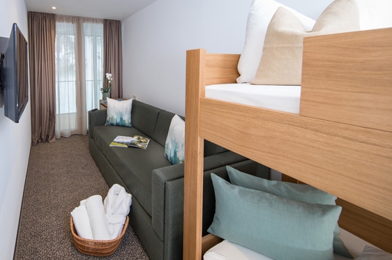 Familiekamer balkon (2-6 personen): type Familiensuite, min. 47 m2 en voorzien van 2-persoonsbed, 2-persoonssofabed, tv, WiFi, minibar en kluisje. Aparte slaapkamer met 2x 1-persoonsbed. Badkamer met bad/douche en föhn. Apart toilet. Badjas mogelijk. Balkon.